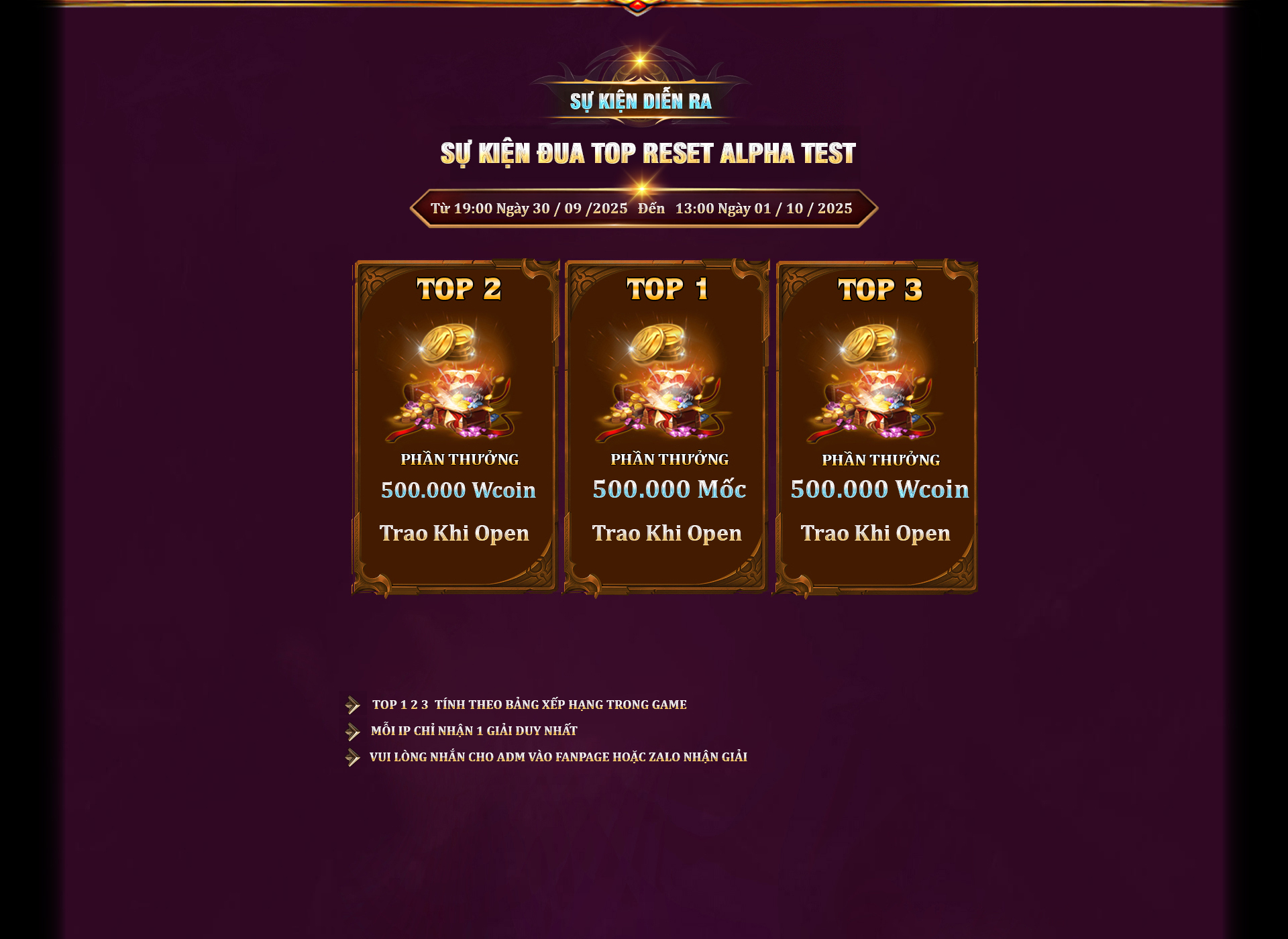 Alpha Test : 19h Ngày 30/09/2025 | Open Beta : 19h Ngày 01/10/2025 |
