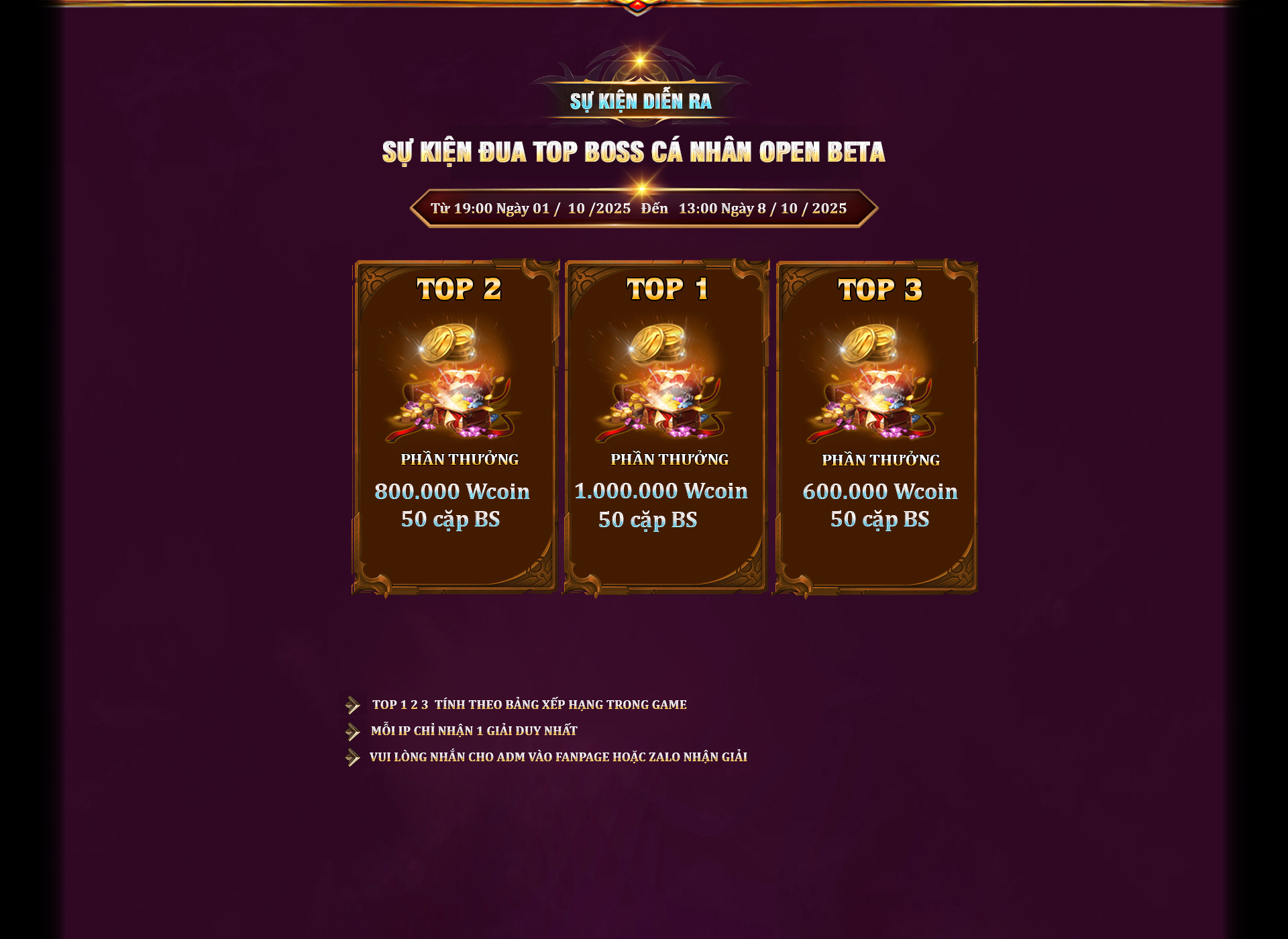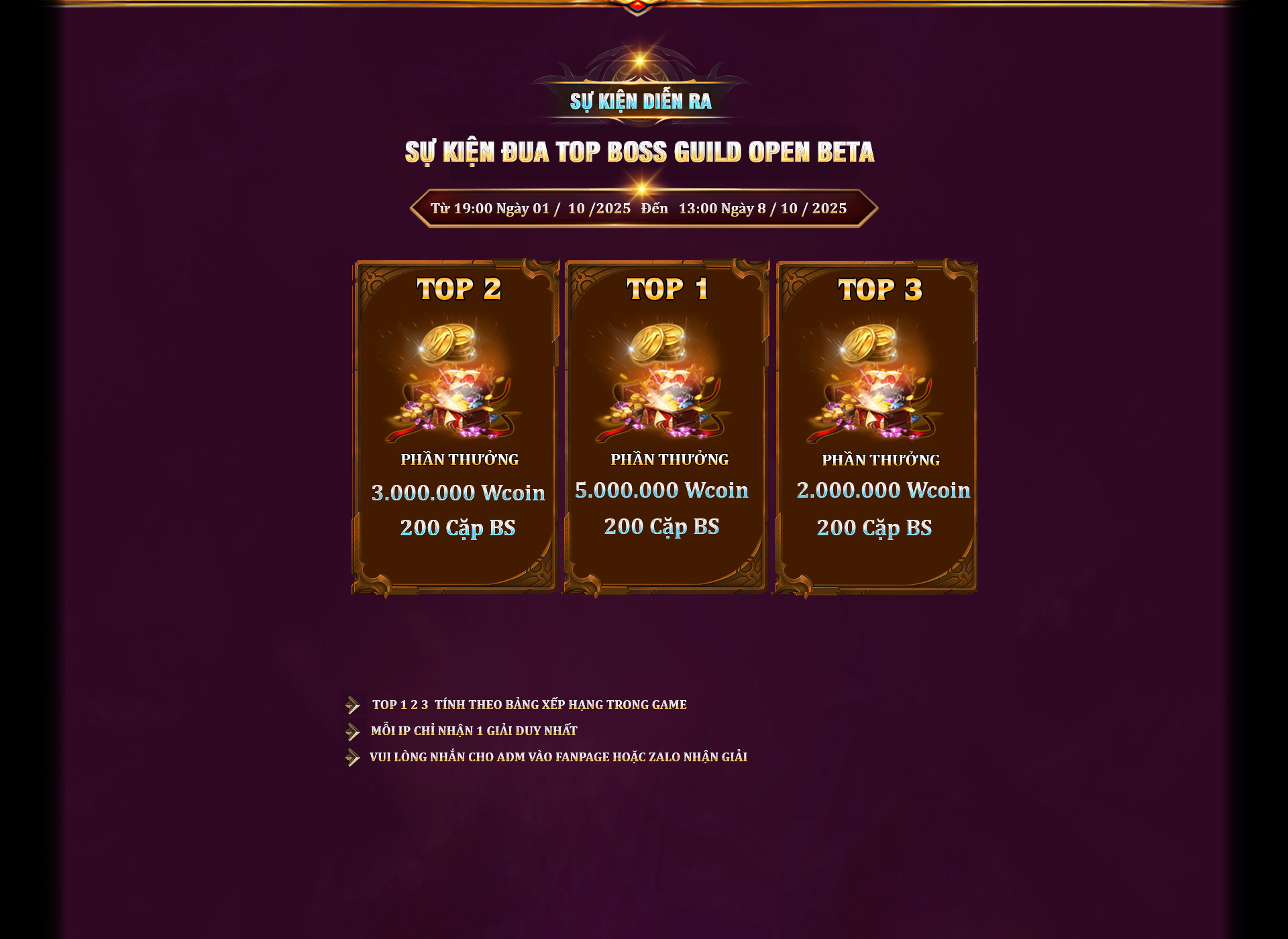 NGÀY ĐẦU OPEN MỞ | DROP ITEM CẤP 5 & VŨ KHÍ CẤP 7 100 Điểm Master MAX ITEM +10 & WING 1 RING PEN +10 | SAU 1 Tuần | wing 2 Item+11 ring pen +11 , 150điểm master | SAU 2 Tuần | vkr, sói tinh Set Cấp 6 Item+12 cộng hưởng 2op, 200điểm master | SAU 3 Tuần | wing 2.5 sói hoàng kim , ring pen +13, 300điểm master | SAU 4 Tuần | item cấp 7 item +13 ring pen+13, 250điểm master |